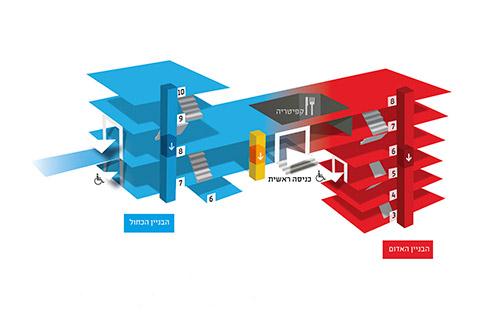 עשינו סדר בבניין, על ידי פתרון פשוט של מיתוג הבניינים כ"בניין האדום" וה"בניין הכחול", המבוסס על העובדה הארכיטקטונית שהבניין הוא למעשה 2 בניינים מחוברים ביניהם, בצורה שאפילו סטודנטים שלומדים במקום לא מצליחים לזהות.